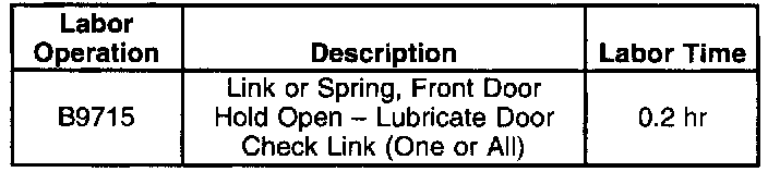 Slide the check link grommet back and spray GM Lubriplate(R) Lubricant, P/N 89021668 (in Canada, use P/N 89021674), or equivalent, on the check link saddle using a "straw" type nozzle extension. The nozzle extension should be inserted slightly into the opening above the check link arm and sprayed toward the outside of the door. If the nozzle is inserted too far into the door, it will go past the check link spring saddle and the lubricant will miss its target. Move the nozzle back and forth while spraying to distribute the lubricant. Open and shut the door until the noise is gone. Reinstall the check link grommet in the door.