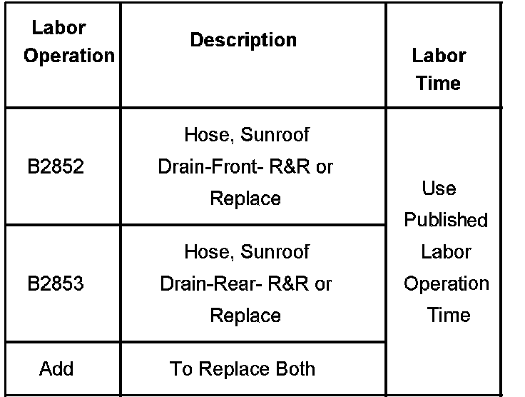 Open the sunroof and check for debris; also check the end of the hose before removal. If the end or the top of the drain is not plugged, refer to Sunroof Drain Hose Replacement-Front , or Sunroof Drain Hose Replacement-Rear.