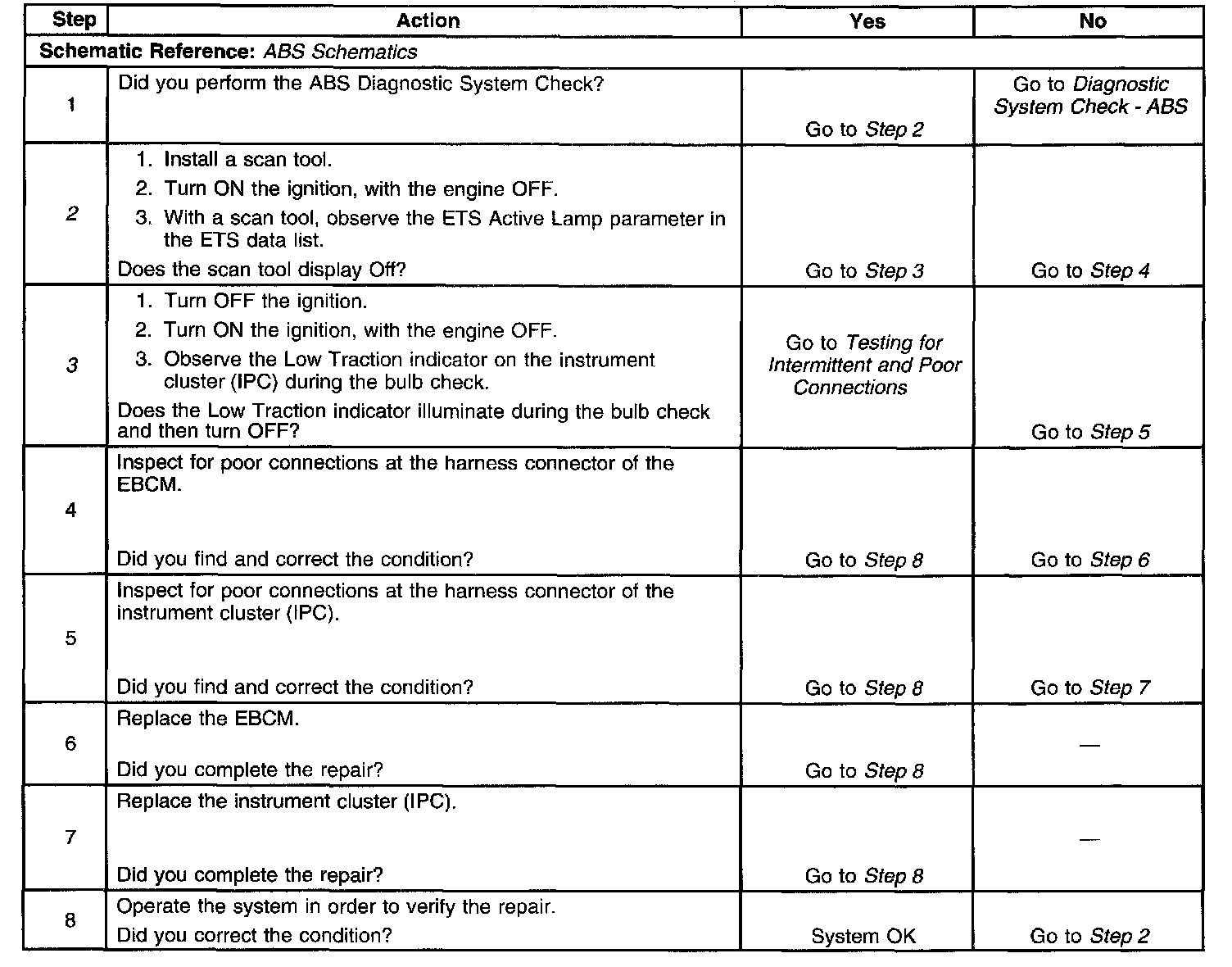 The Low Traction indicator is controlled by the instrument cluster via serial data messages from the EBCM. When the ABS or TCS is active for 0.5 seconds, the EBCM commands the instrument cluster to turn ON the Low Traction indicator.