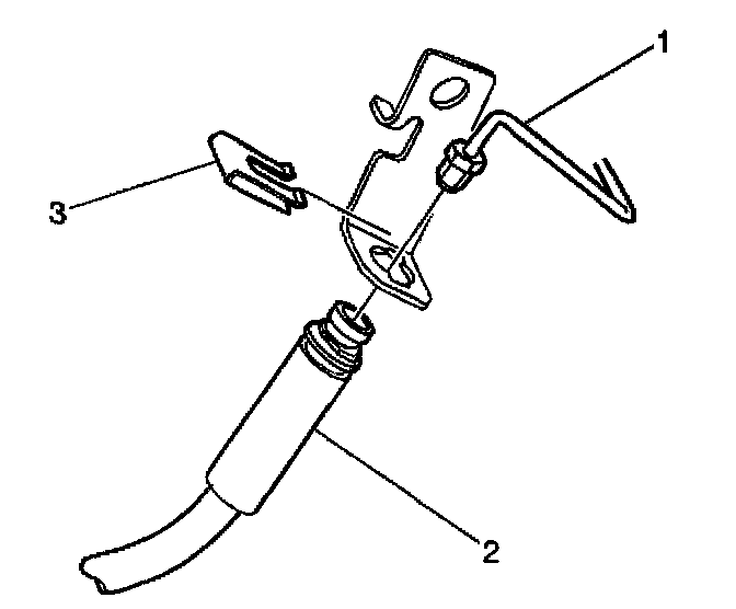 4. Position the brake hose (2) into the mounting bracket and install the retaining clip (3).
