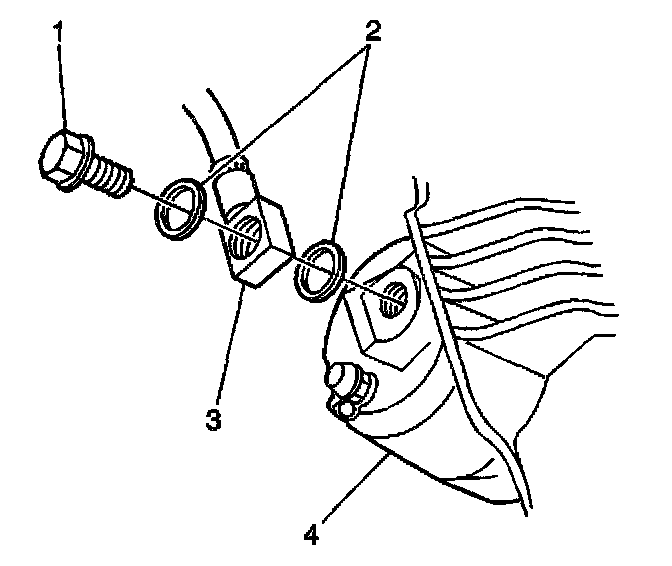 9. Remove and discard the 2 copper brake hose gaskets (2). These gaskets may be stuck to the brake caliper and/or the brake hose end.