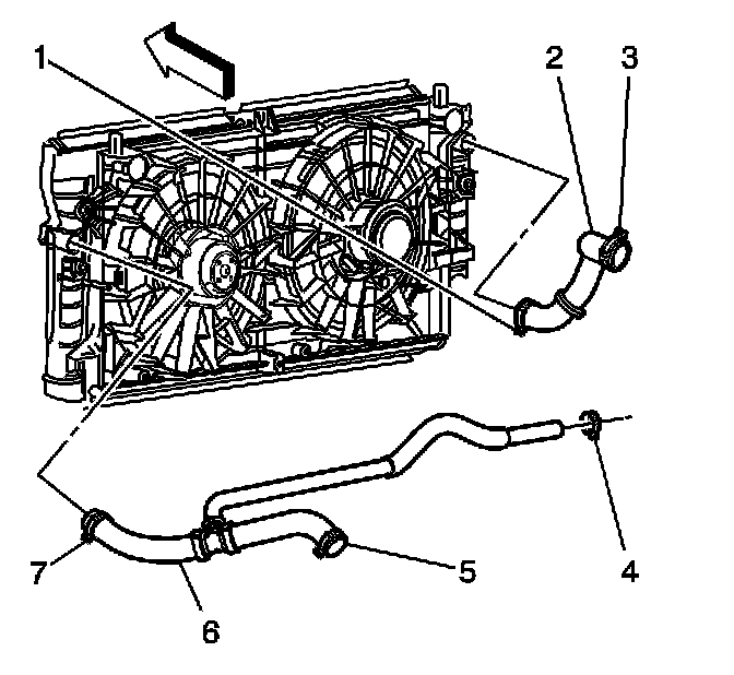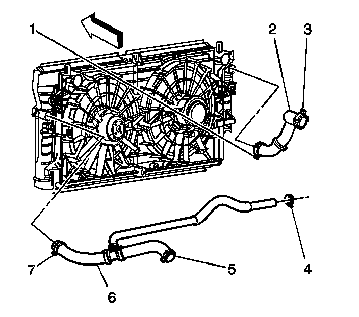 18. Use the J 38185 in order to reposition the surge tank outlet/radiator outlet hose clamp (7) from the radiator.