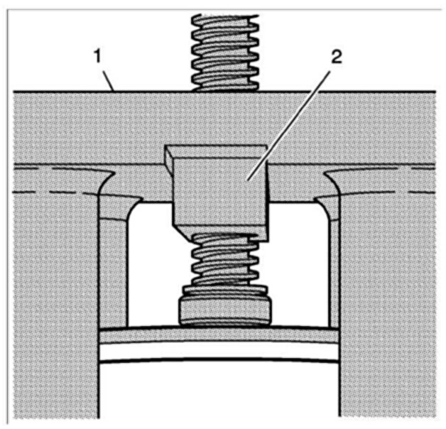 6. Align the pusher block (2) of EN 45680-853 cylinder bore sleeve installer into the groove of EN 45680-851 fixture (1).