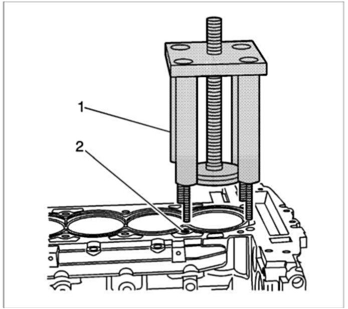 10. Remove the EN 45680-851 fixture and EN 45680-853 cylinder bore sleeve installer assembly (1) from the cylinder block (2).