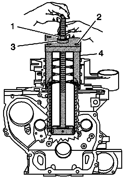 4. Hold the threaded shaft upward in order to retain the shoe alignment to the bottom of the cylinder bore liner. Tighten the nut (1) to the bearing (3).