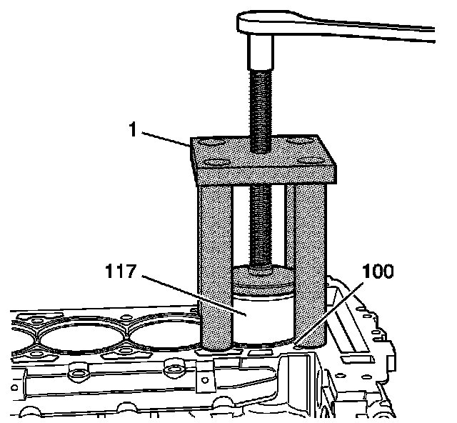 8. Using a ratchet rotate the threaded shaft of EN 45680-851/EN 45680-853 assembly (1) in order to install the cylinder bore liner (117) into the engine block (100).