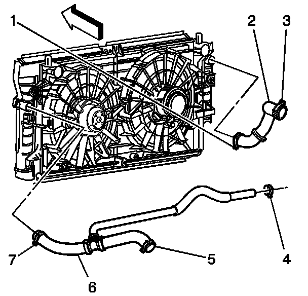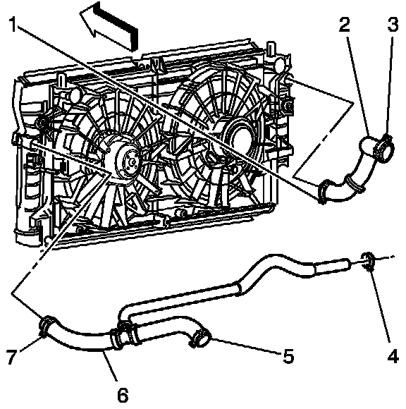 18. Use the J 38185 in order to reposition the surge tank outlet/radiator outlet hose clamp (7) from the radiator.