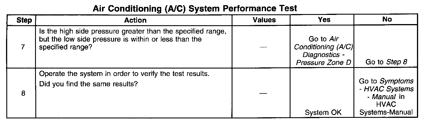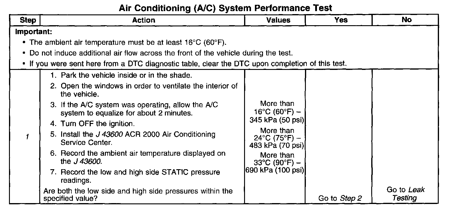 1. This step determines if the A/C system has at least the minimum refrigerant charge required to operate the system without damage.