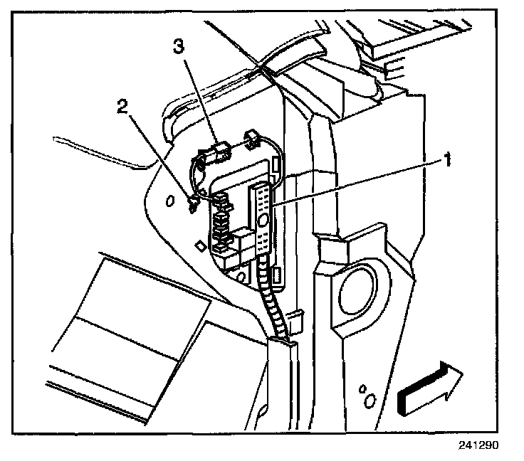 9. Remove the CPA (2) from the inflatable restraint IP module connector (3) located above the RH IP wiring harness junction block.