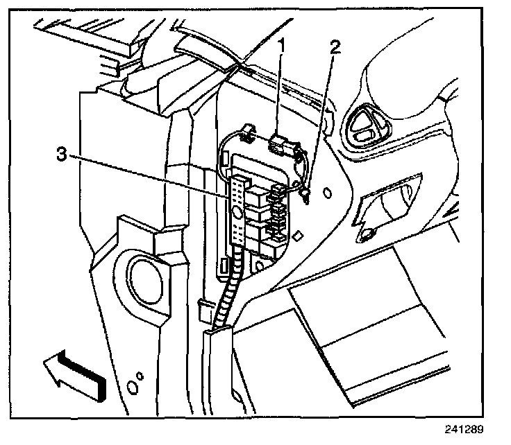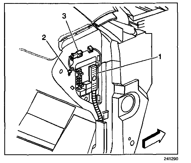 1. Connect the inflatable restraint IP module connector (3) located above the RH IP wiring harness junction block.
