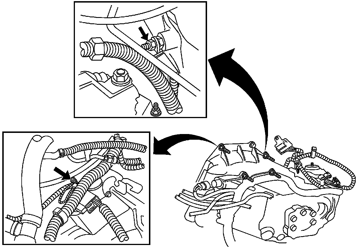 1. Locate ground G103 using the illustration above. The forward transmission stud is the ground location (lower left illustration) on four cylinder engines. The rear transmission stud is the ground location (upper left illustration) on six cylinder engines.