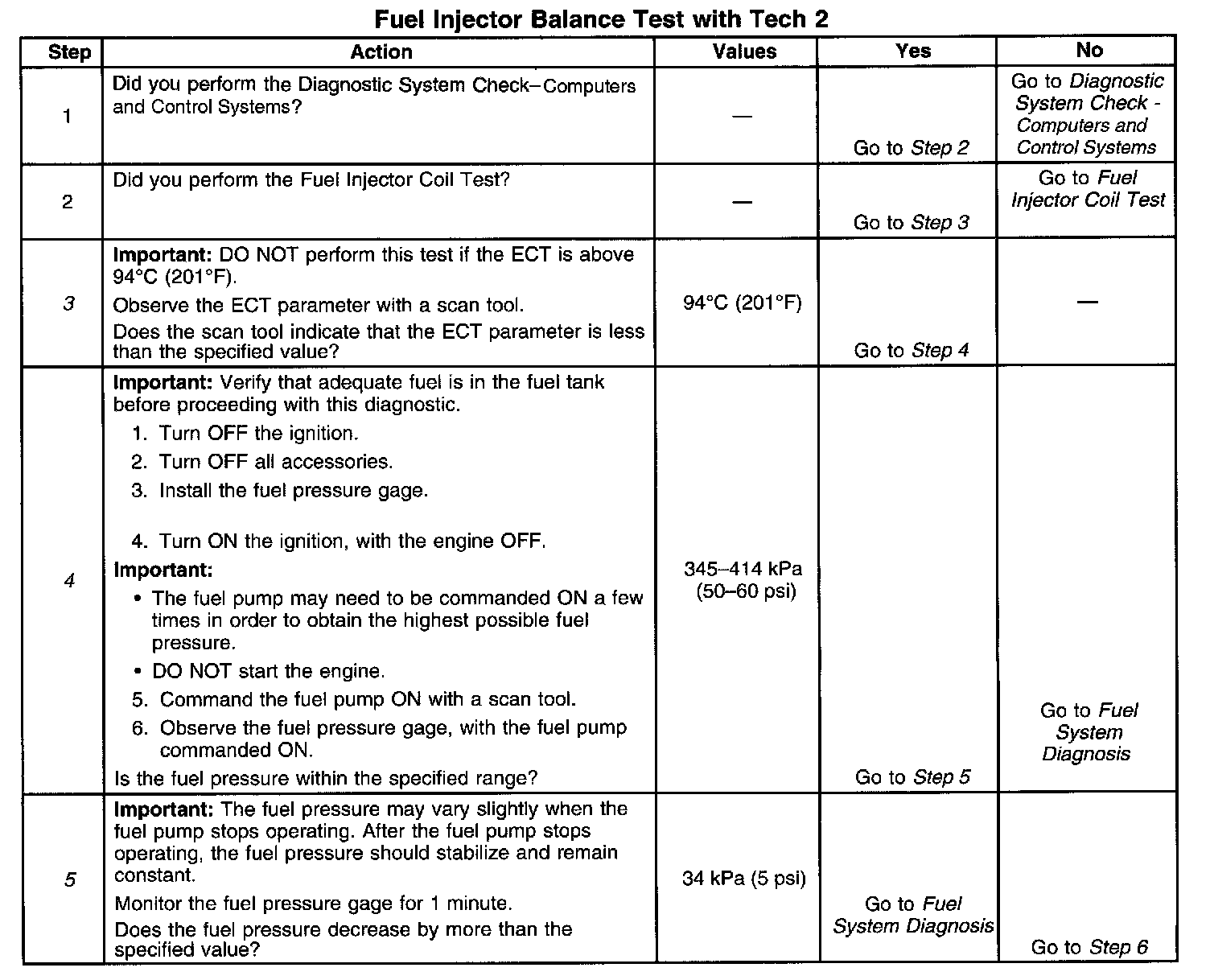 5. The fuel pressure should reach a steady value. Refer to Fuel System Diagnosis if the fuel pressure does not stabilize. Component Tests and General Diagnostics