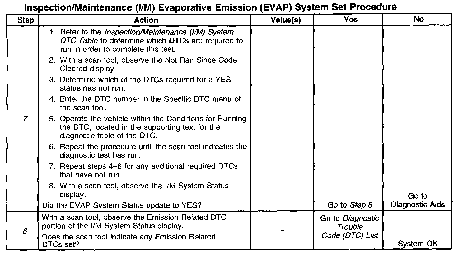 6. This step is to identify a first failure of a type B DTC. A DTC only appears on the I/M System Status display when the DTC becomes a MIL illuminating DTC. This occurs on the second failure of a type B DTC. A first failure of a type B DTC will not allow the I/M System Status to update to YES. Refer to Diagnostic Aids.