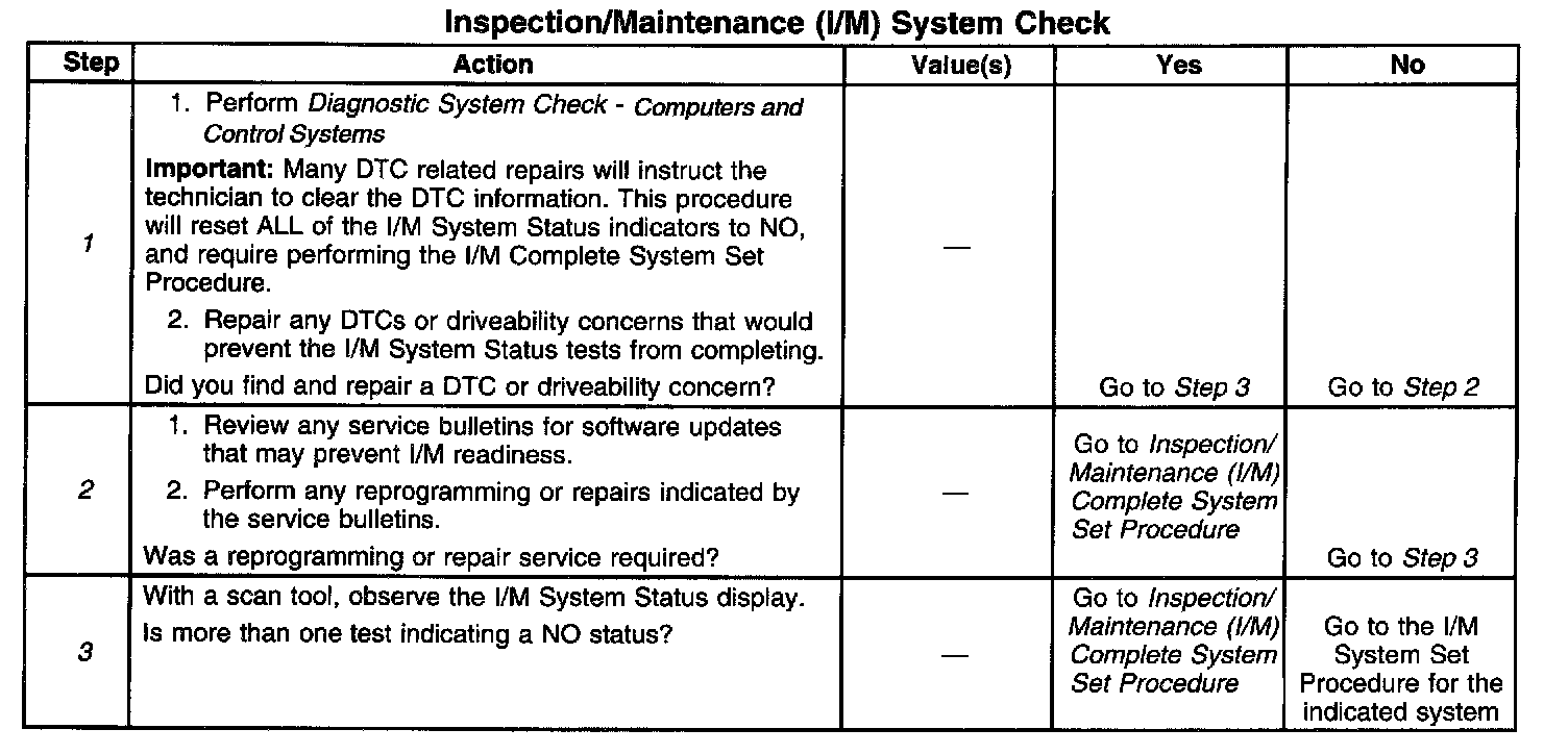 2. Anytime a control module is reprogrammed or the diagnostic trouble codes are cleared as part of a repair procedure, all the I/M System Status indicators will reset to NO.