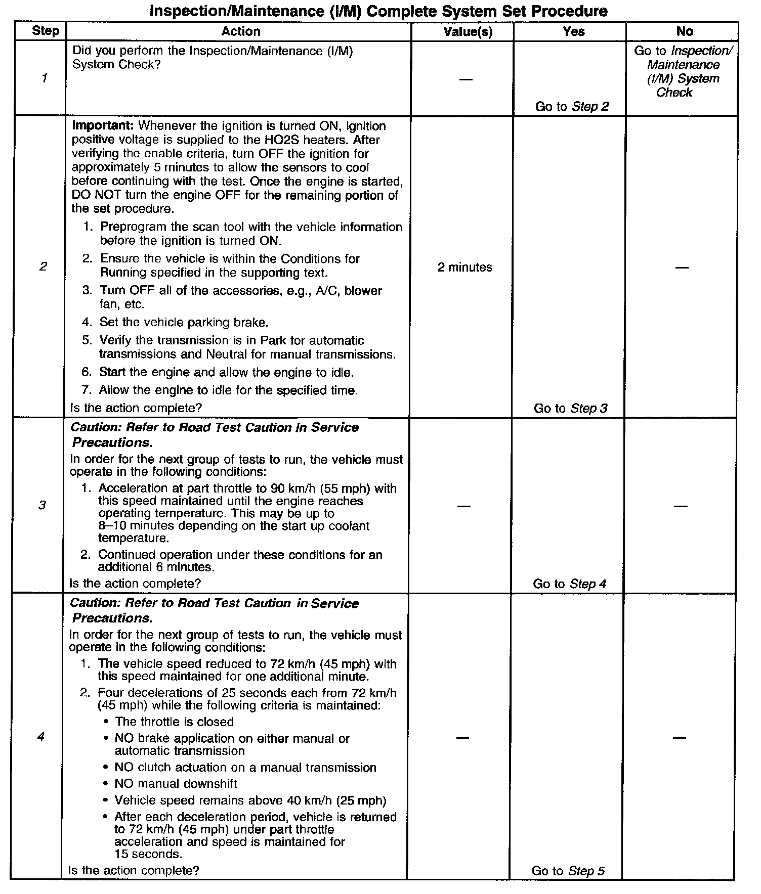 DESCRIPTIONThe purpose of the I/M Complete System Set Procedure is to satisfy the enable criteria necessary to execute all of the I/M readiness diagnostics, and complete the trips for those particular diagnostics. When all diagnostic tests are completed, the I/M System Status indicators are set to YES. Perform this test when more than one or all of the I/M System Status indicators are set to NO.