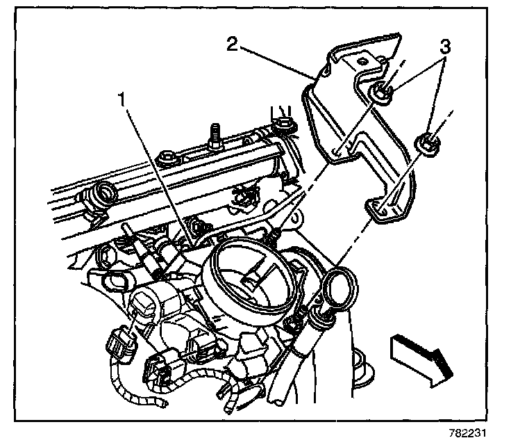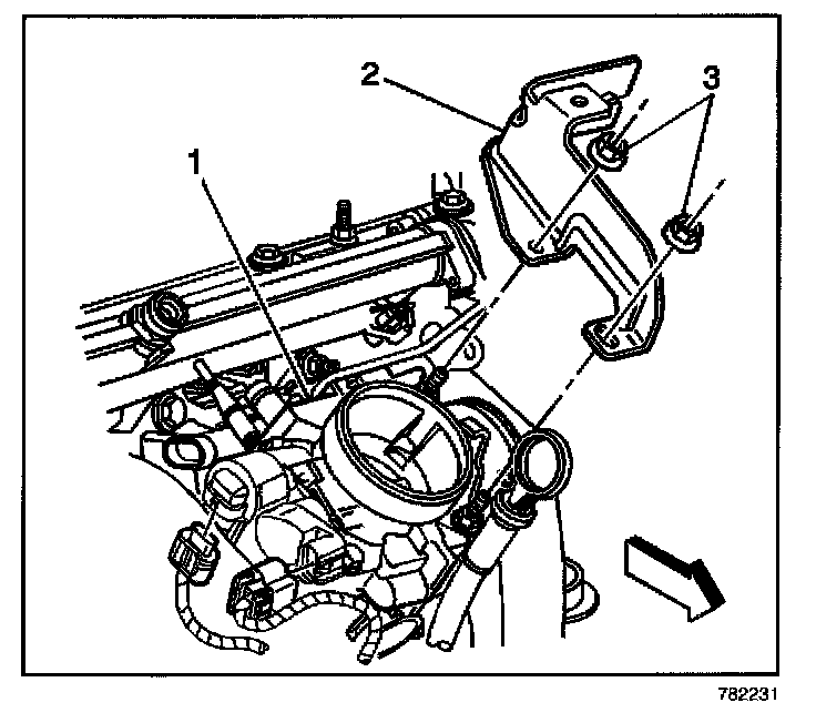 3. Connect the cruise control cable (2) from the throttle body (3) and accelerator bracket (1).