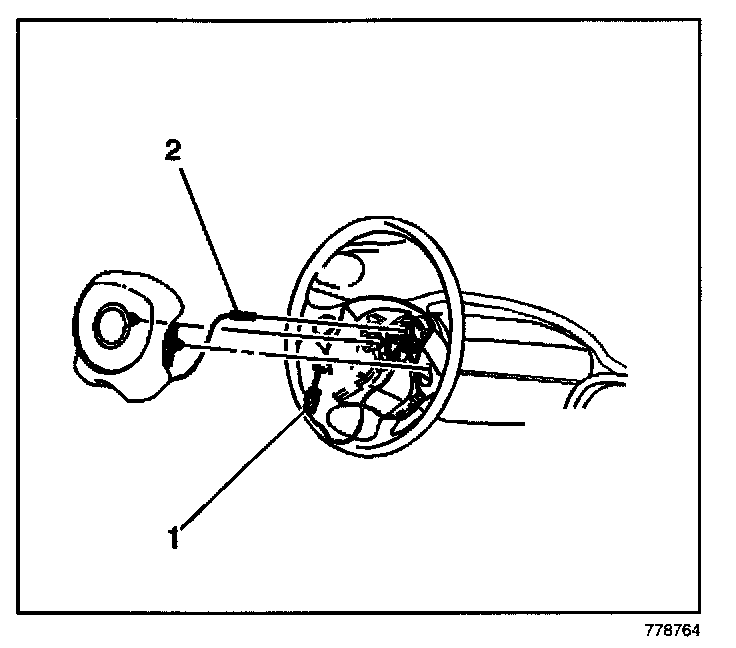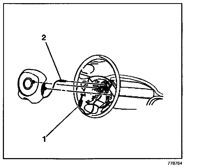 4. Rotate the horn contact lead (2) clockwise 1/4 turn in order to install the horn contact lead to the steering column shaft tower.
