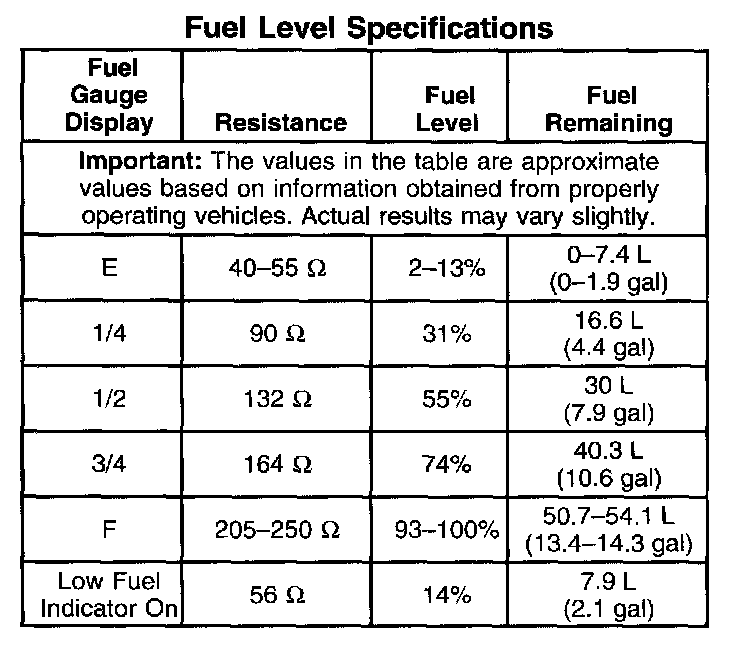 Fuel Level Specifications: