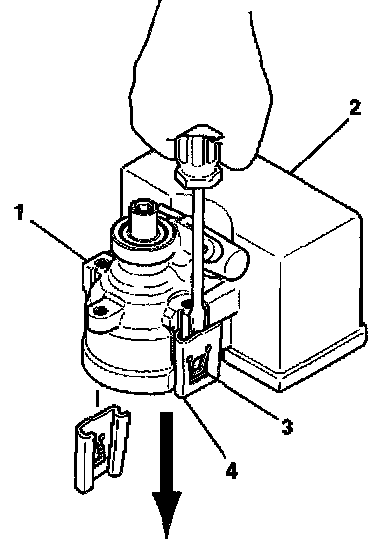 4. Slide the reservoir clip (4) away from the hydraulic pump assembly (1).