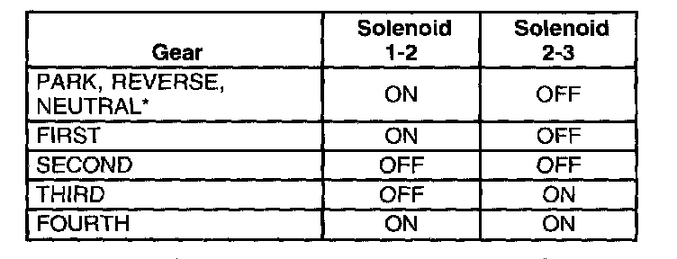 Important: The solenoid states are normally ON (1-2) and OFF (2-3) in the P, R, and N gears. However, these may change based on the vehicle speed and the throttle position.