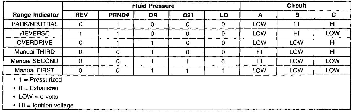 Five of the fluid pressure switches are normally-open. These are used to indicate the position of the manual valve. The PCM uses this information to control line pressure, TCC apply and release and shift solenoid operation.