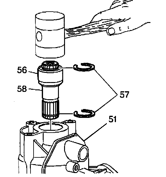 10. Install the two new snap rings (57) on the stub shaft (58). The snap rings (57) are not reusable after you remove the shaft (58).