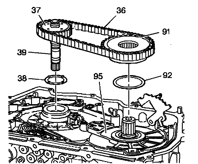 Important: When removing the drive link assembly (36) note which direction the chain faces. You must later install the chain in the same direction in order to prevent excessive noise.1. Remove, as an entire unit, the drive sprocket (37), the turbine shaft (39), the driven sprocket (91) and the drive link assembly (36).