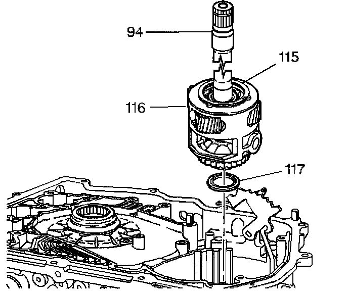 1. Remove, as one unit, the output shaft (94), the final drive assembly (116), and the final drive sun gear (115).