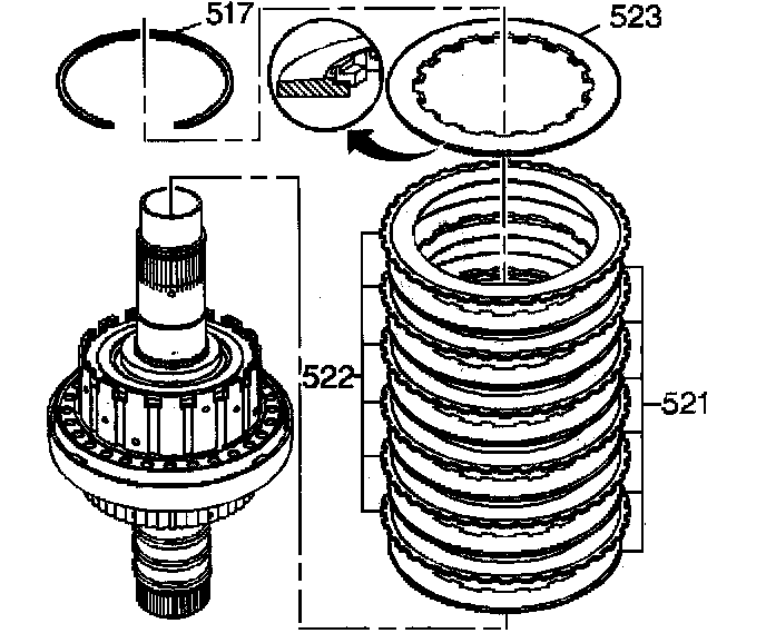 11. Remove the direct clutch plates from the direct coast clutch input housing. The direct clutch consists of a backing plate (523), steel plates (521) and fiber plates (522).