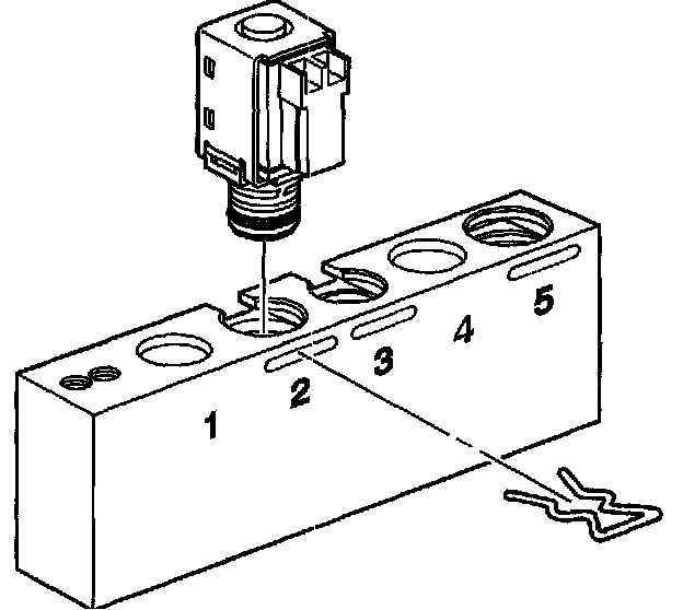 2. Install the 1-2 shift solenoid valve or the 2-3 shift solenoid valve into bore number 2 of the J44246 and install the factory retainer clip to retain the solenoid.