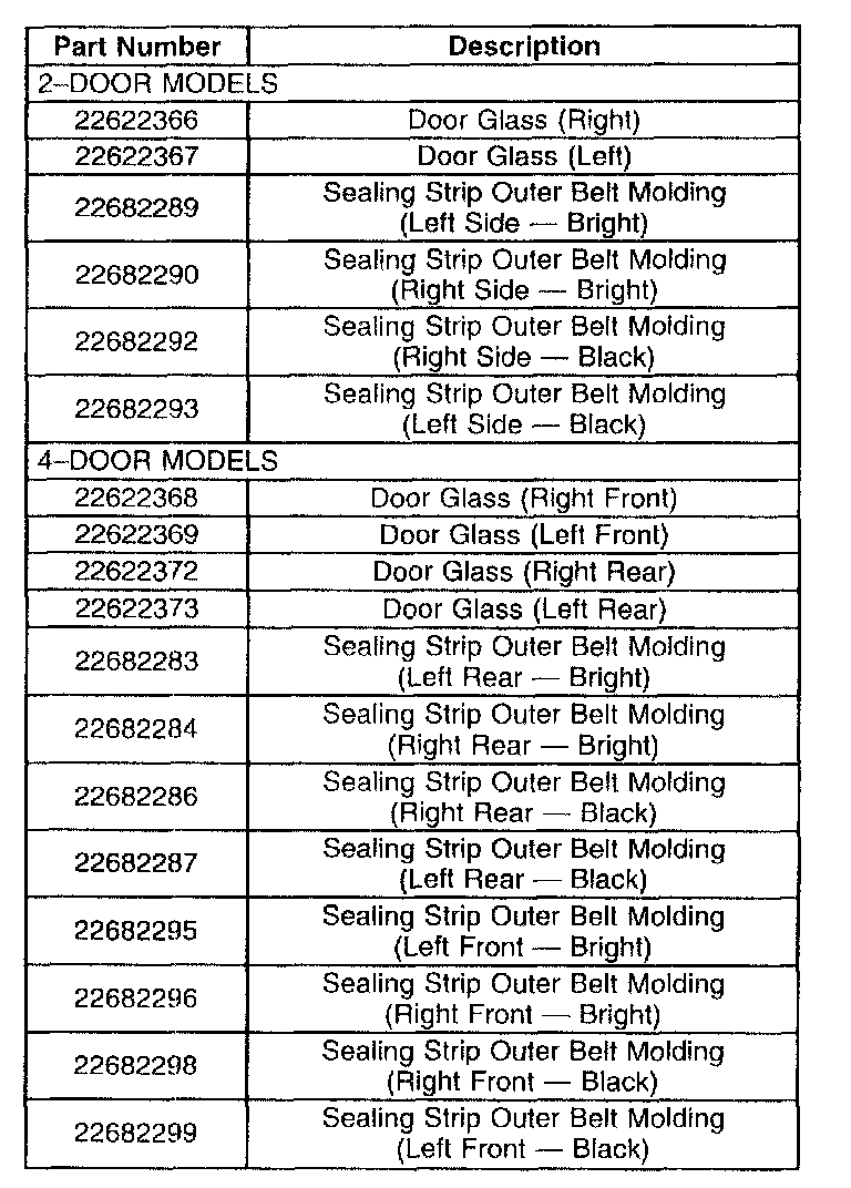 Do not replace the sealing strip outer belt molding on 1999-2001 vehicles that have already had the new updated molding installed. The belt moldings can be identified by visually noting that the old molding has 4 attachment clips and the new updated molding has no clips.
