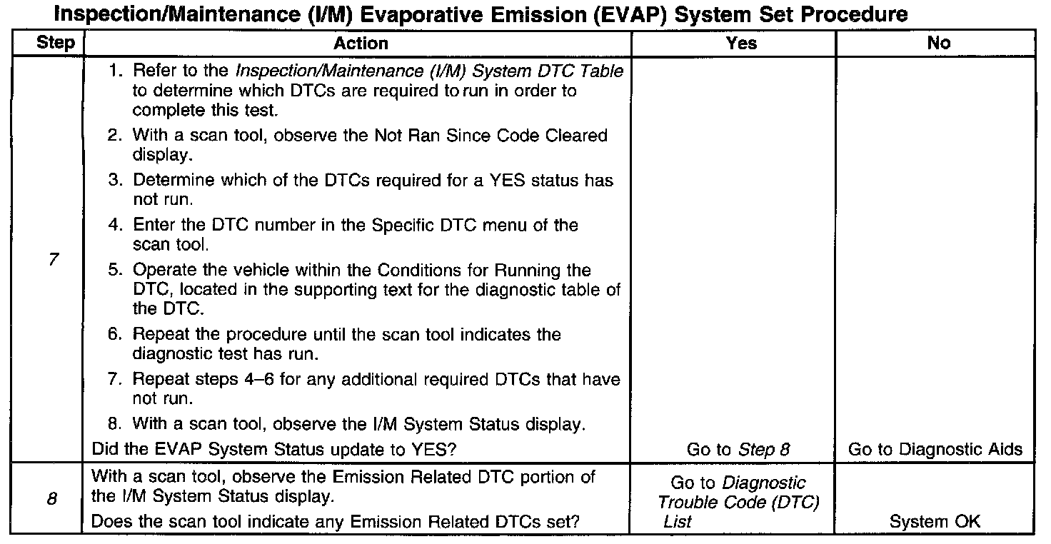6. This step is to identify a first failure of a type B DTC. A DTC only appears on the I/M System Status display when it becomes a MIL illuminating DTC. This occurs on the second failure of a type B DTC. A first failure of a type B DTC will not allow the I/M System Status to update to YES. Refer to Diagnostic Aids.