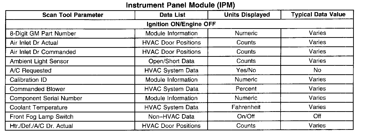 Scan Tool Data List - Instrument Panel Module (IPM)