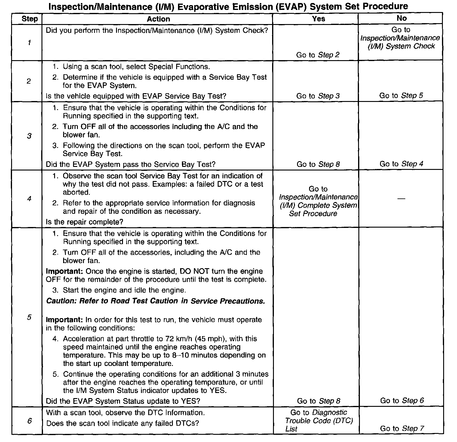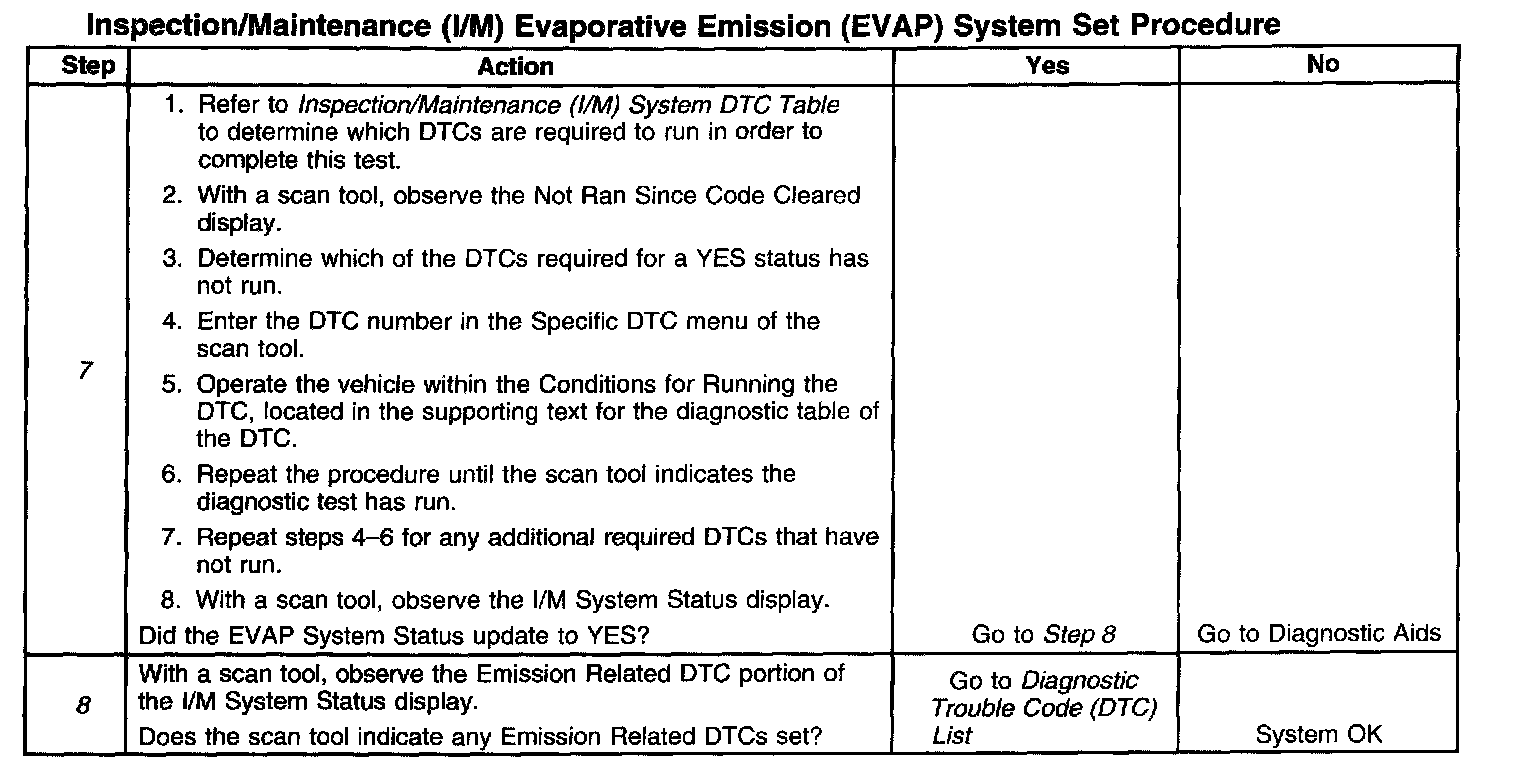 6. This step is to identify a first failure of a type B DTC. A DTC only appears on the I/M System Status display when it becomes a malfunction indicator lamp (MIL) illuminating DTC. This occurs on the second failure of a type B DTC. A first failure of a type B DTC will not allow the I/M System Status to update to YES. Refer to Diagnostic Aids.