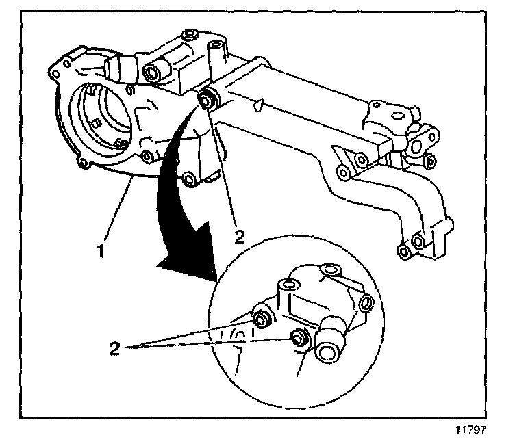 4.2. Remove the 2 plugs (2) and clean the passages with a wire brush. Remove all loose particles.