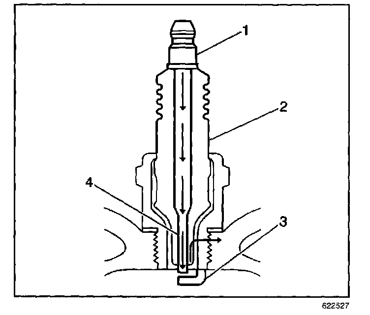 ^ Inspect the insulator (2) for cracks. All or part of the electrical charge may arc through the crack instead of the electrodes (3, 4).