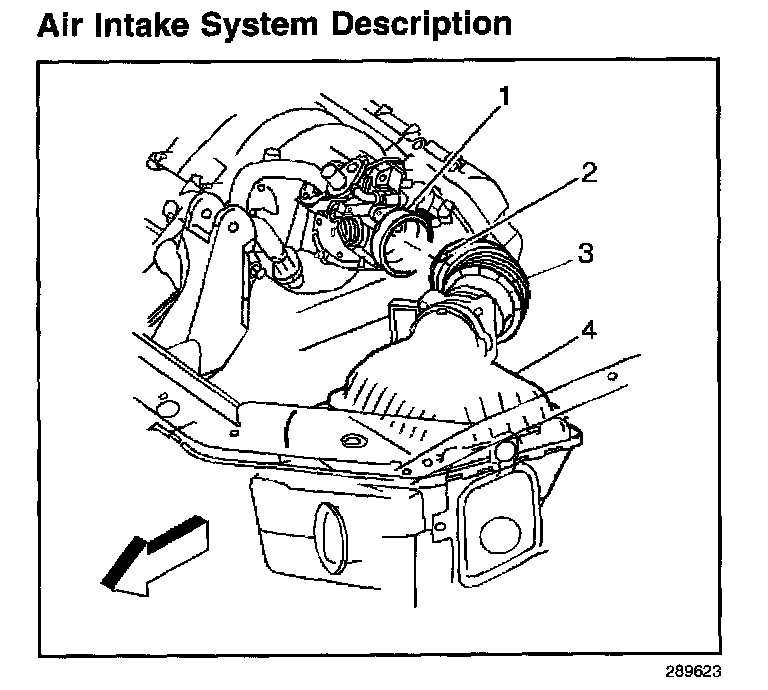 The air induction system provides contaminant and sound filtration of the outside air as the air is drawn into the engine. A remotely mounted air cleaner prevents contaminants in the air from entering the engine. The air cleaner assembly (4) also acts as a resonator to reduce any air induction noise. The filtered air then enters the engine by flowing through the intake air duct (3), the throttle body (1), into the intake manifold, through the cylinder head intake ports, and finally into the cylinders.