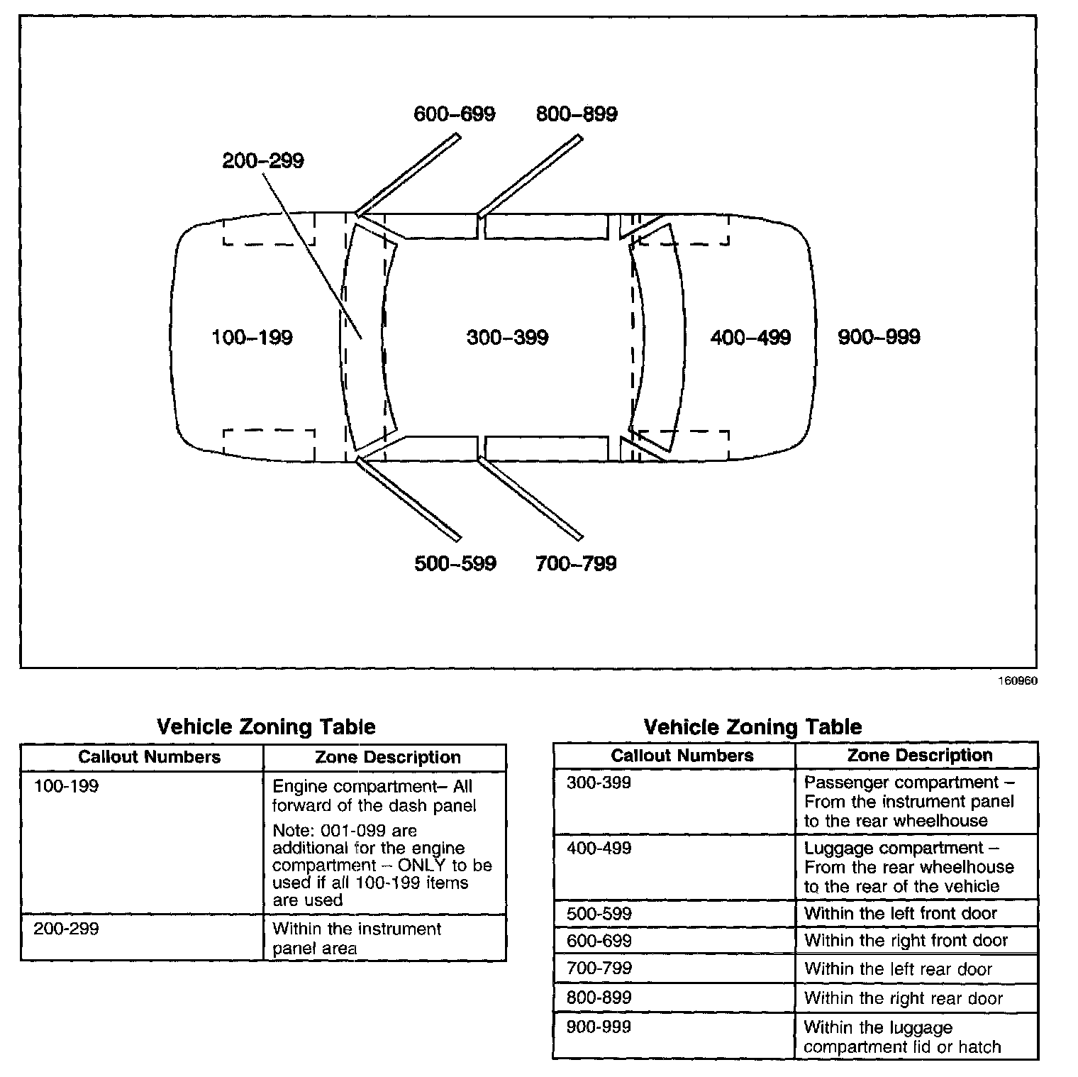 All grounds, in-line connectors, pass-through grommets, and splices have identifying numbers that correspond to where they are located in the vehicle. The table explains the numbering system.