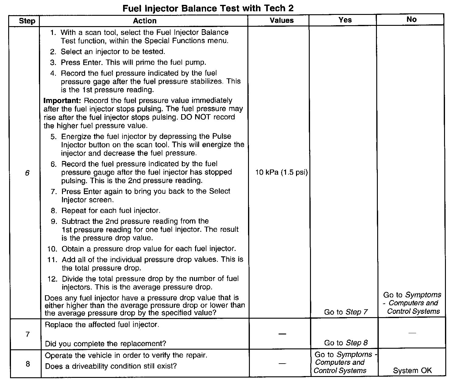 CIRCUIT DESCRIPTIONThe scan tool first energizes the fuel pump, and then energizes the injectors for a precise amount of time, allowing a measured amount of fuel into the manifold. This causes a drop in system fuel pressure that can be recorded and used to compare each injector.