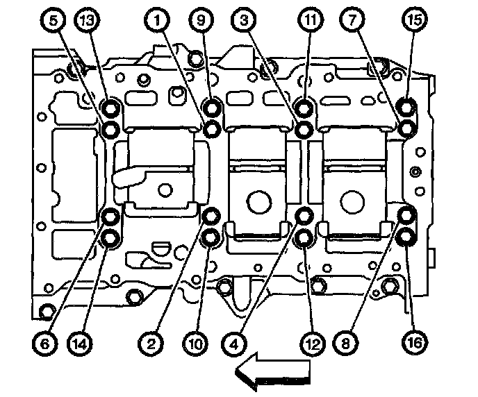 1. Tighten the lower crankcase bolts (1 through 16) in proper sequence.