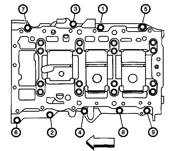 2. Tighten the lower crankcase perimeter bolts (1 through 9) in proper sequence.