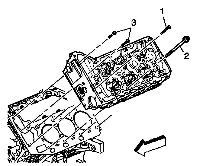 2. Install the M6 bolts at the front of the cylinder head. Install the longer M6 bolt (1) in the outboard location as shown. Install the two shorter M6 bolts (3) in the locations shown.