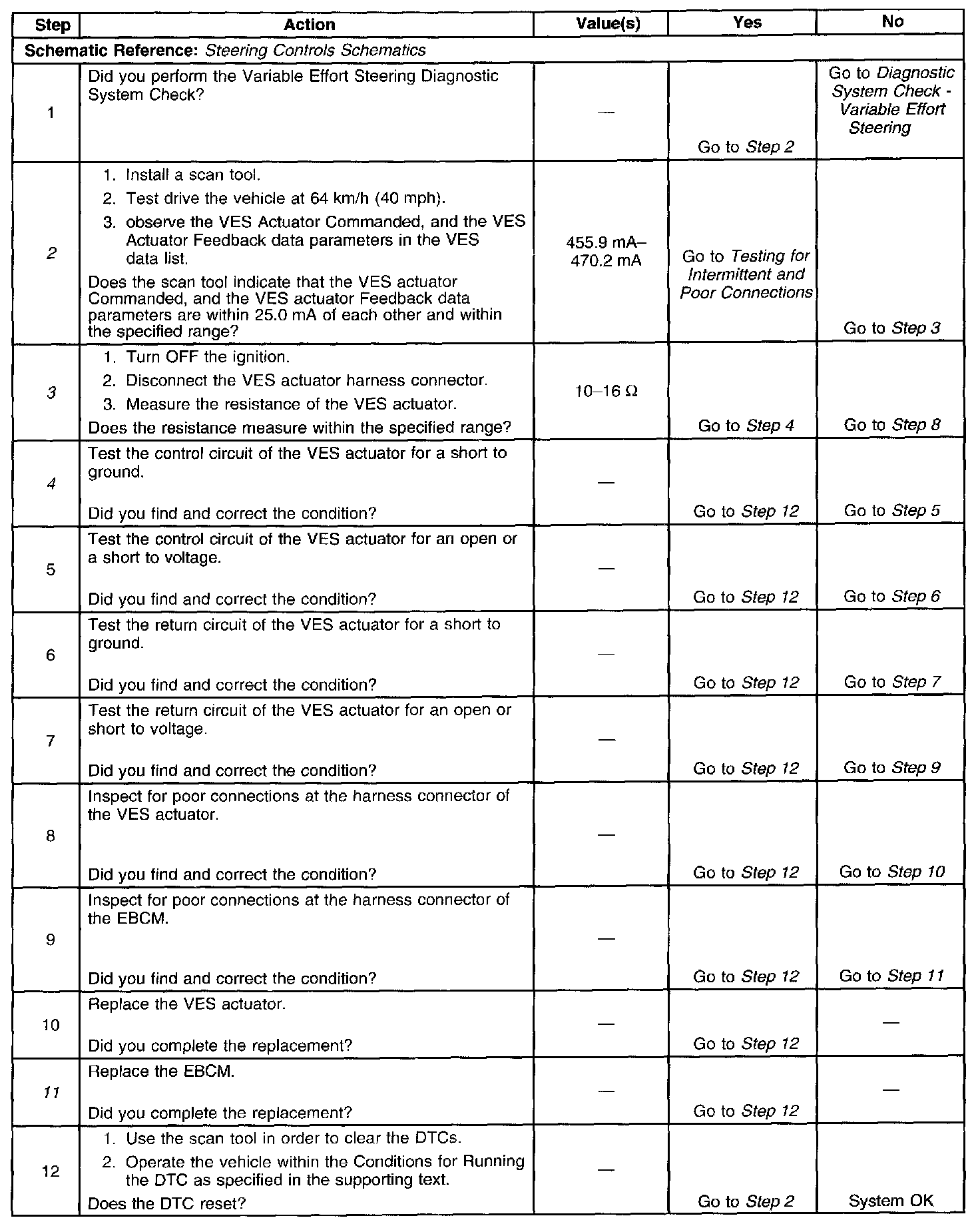 The Variable Effort Steering (VES) system uses the Electronic Brake Control Module (EBCM) to provide a control and return circuit for the VES actuator. The EBCM commands current from 0-619 mA depending on vehicle speed and steering position sensor signal voltage input. The EBCM compares the commanded and feedback currents to detect malfunctions in the VES actuator or the circuits to the actuator.