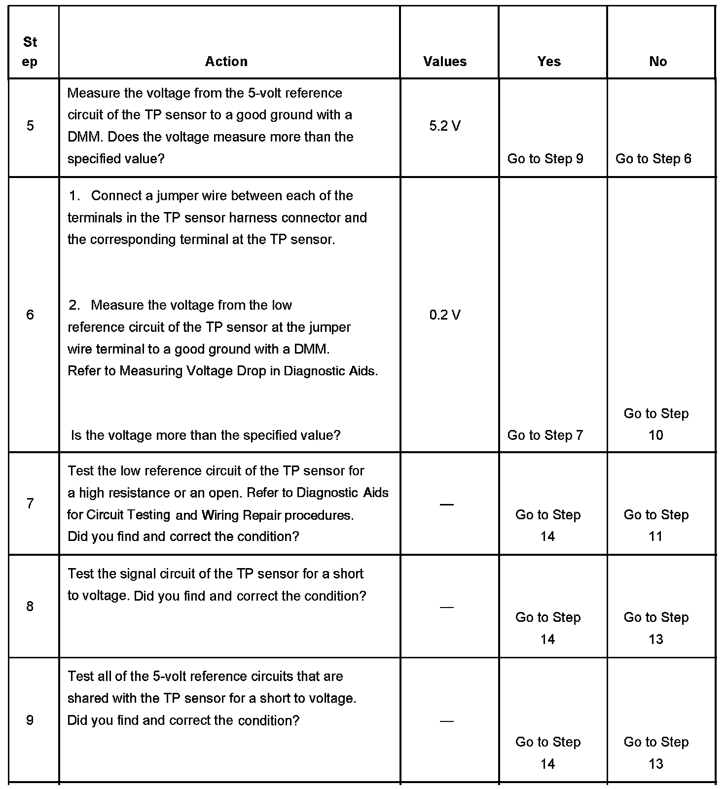The PCM provides the TP sensor with 5 volts on the 5-volt reference circuit and a ground on the low reference circuit. Rotation of the TP sensor rotor from the closed throttle position to the wide open throttle (WOT) position provides the PCM with a signal voltage from less than 1 volt to more than 4 volts through the TP sensor signal circuit. If the PCM detects an excessively high signal voltage, DTC P0123 will set.
