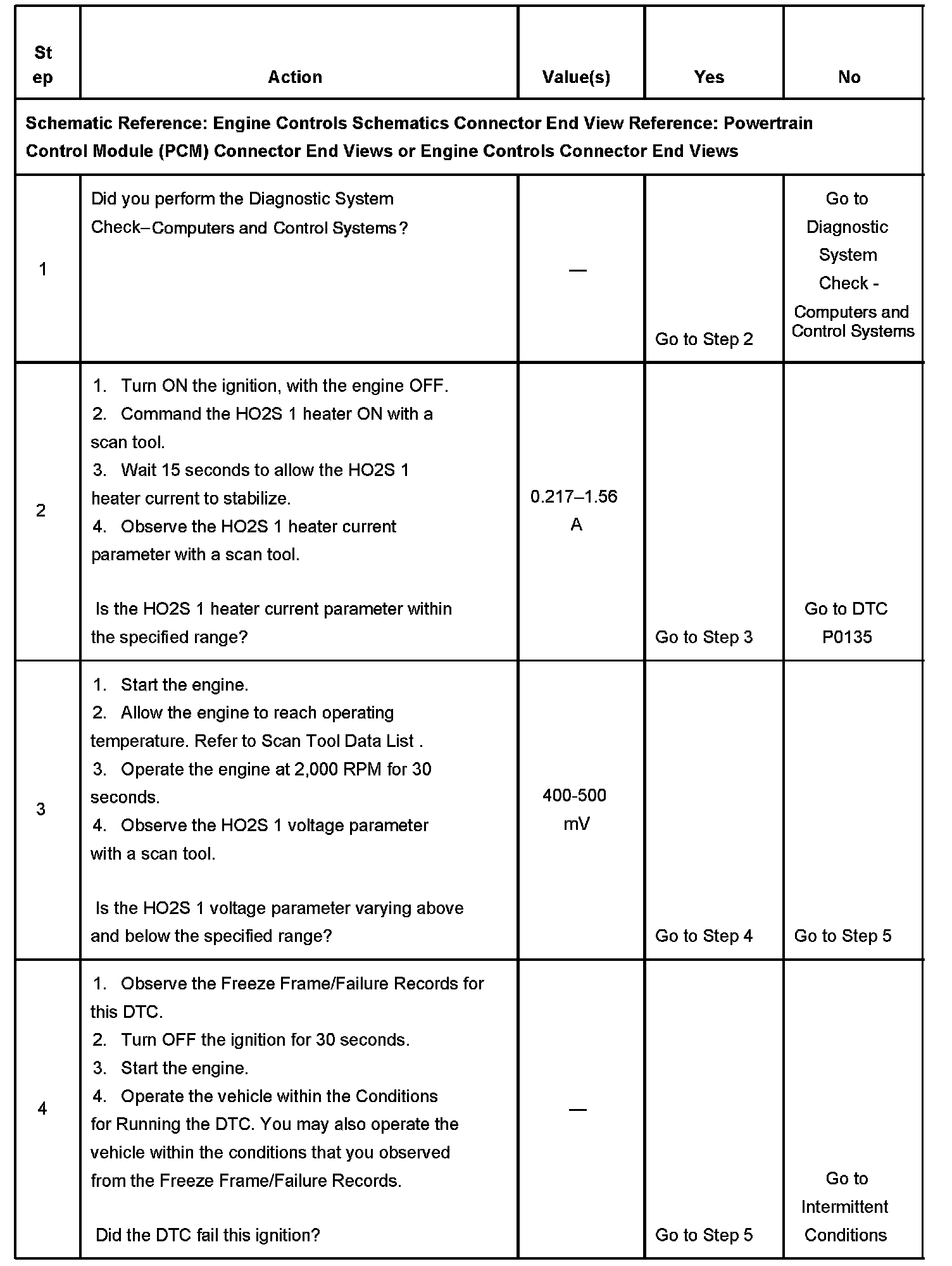 The PCM detects that the HO2S 1 parameter is between 400-500 mV for 125 seconds.