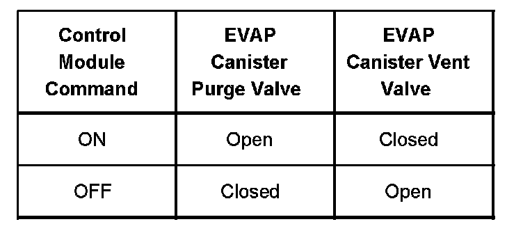 The table illustrates the relationship between the ON and OFF states, and the OPEN or CLOSED states of the EVAP canister purge and vent valves.