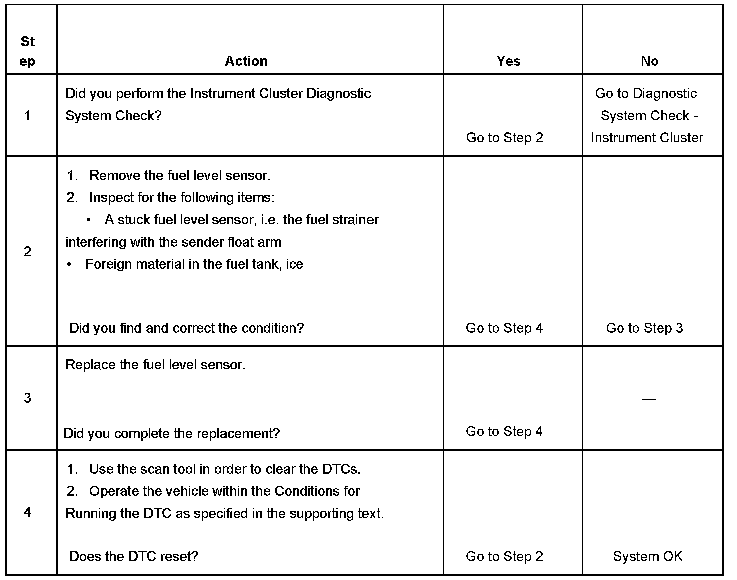 The fuel level sensor changes resistance based on fuel level. The PCM monitors the signal circuit of the fuel level sensor in order to determine the fuel level. When the fuel tank is full, the sensor resistance is high and the PCM senses a high signal voltage. When the fuel tank is empty, the sensor resistance is low and the PCM senses a low signal voltage. The PCM uses the signal circuit of the fuel level sensor in order to calculate the total remaining fuel in the tank. The PCM sends the fuel level volume via the class 2 serial data circuit to the instrument cluster in order to control the fuel gage. The fuel level information is also used for misfire and EVAP diagnostics.