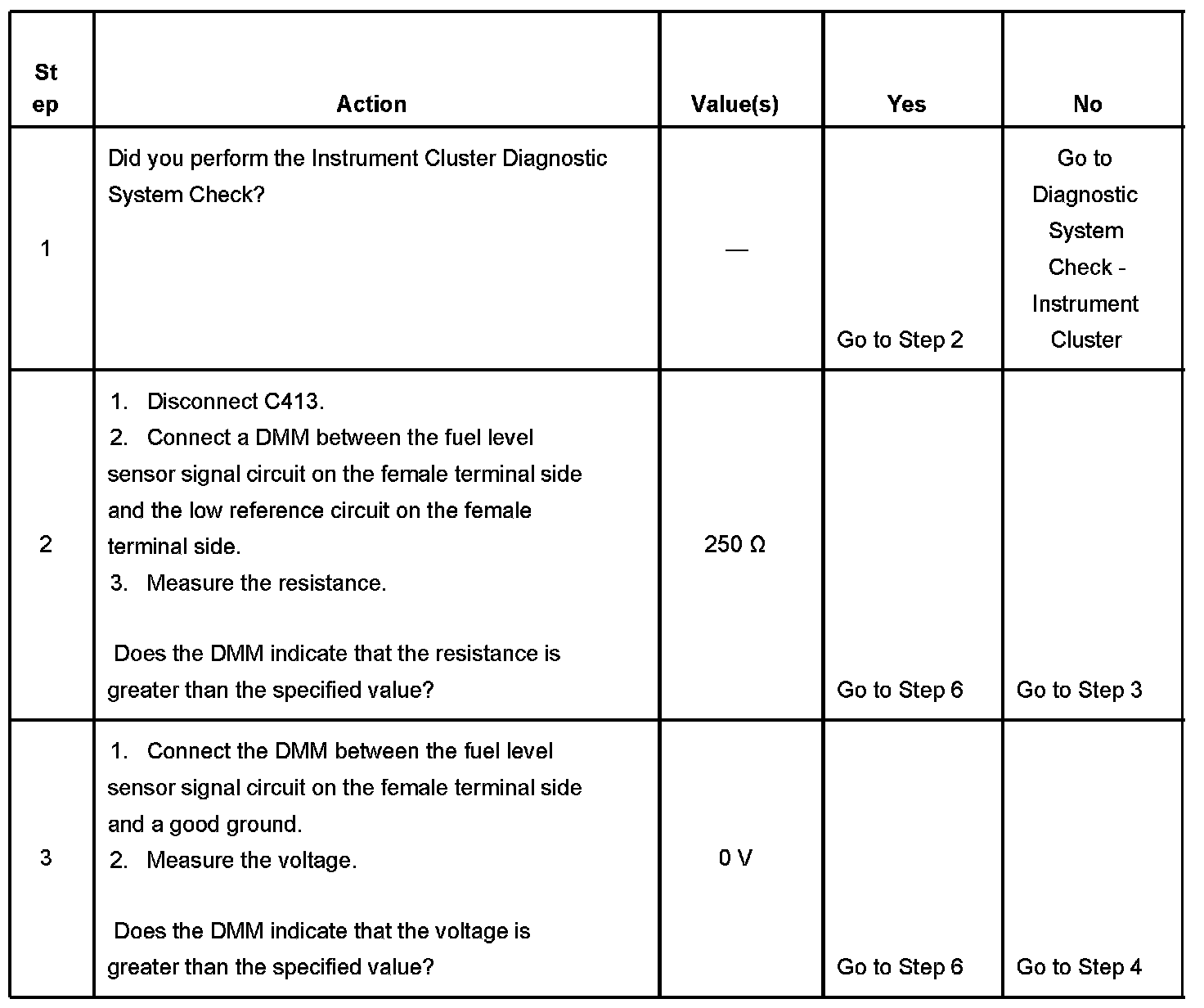The fuel level sensor changes resistance based on fuel level. The PCM monitors the signal circuit of the fuel level sensor in order to determine the fuel level. When the fuel tank is full, the sensor resistance is high and the PCM senses a high signal voltage. When the fuel tank is empty, the sensor resistance is low and the PCM senses a low signal voltage. The PCM uses the signal circuit of the fuel level sensor in order to calculate the total remaining fuel in the tank. The PCM sends the fuel level volume via the class 2 serial data circuit to the instrument cluster in order to control the fuel gage. The fuel level information is also used for misfire and EVAP diagnostics.