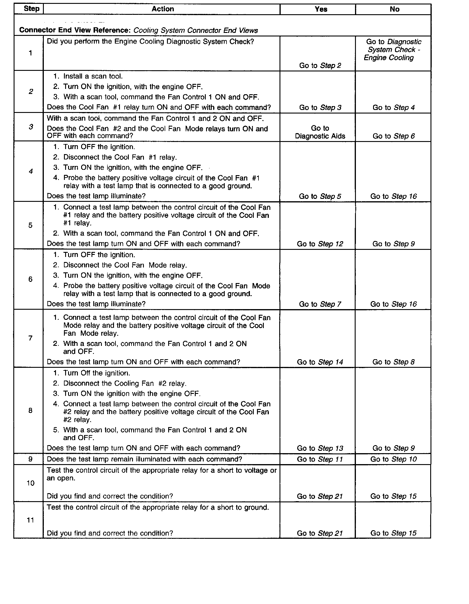 4. Tests for voltage at the coil side of the Cool Fan #1 relay. The COOL FAN #1 fuse supplies battery positive voltage to the coil side of the Cool Fan #1 relay.