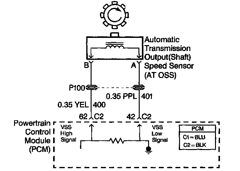 The Automatic Transmission Output Shaft Speed Sensor (AT OSS) provides vehicle speed information to the PCM. The AT OSS is a permanent magnet generator mounted to the transmission case. The AT OSS produces an AC voltage as the transmission speed sensor rotor teeth pass through the sensor's magnetic field. The AC voltage level increases as the speed of the vehicle increases. The PCM converts the AC voltage into a digital signal. The PCM uses the vehicle speed signal to determine shift timing, Torque Converter Clutch (TCC) apply, TCC release, and gear ratio calculations.